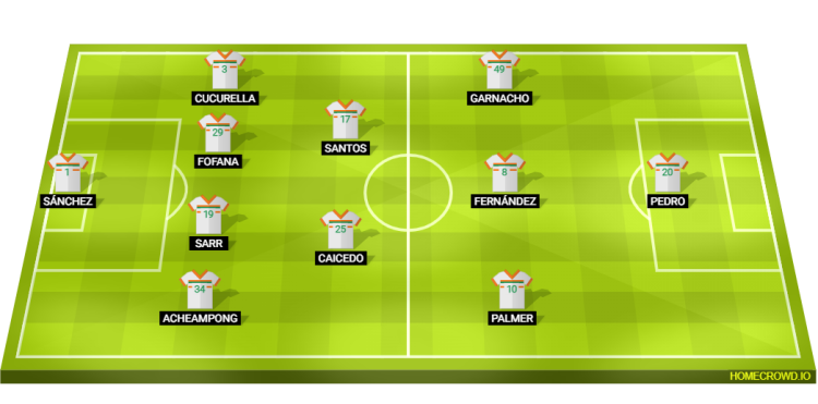 Predicted Chelsea XI: Sanchez; Acheampong, Sarr, Fofana, Cucurella; Caicedo, Santos; Palmer, Fernandez, Garnacho; Pedro
