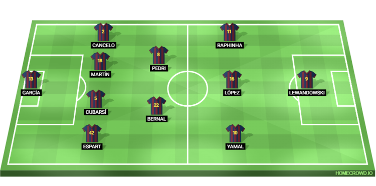 Predicted Barcelona XI: Joan Garcia; Espart, Cubarsi, Martin, Cancelo; Bernal, Pedri; Yamal, Fermin, Raphinha; Lewandowski