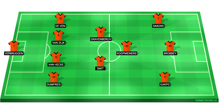 The Netherlands will play in a 4-2-3-1 formation vs Ecuador, with Bart Verbruggen in goal. Denzel Dumfries and Micky van de Ven will start in the full-back roles and look to contribute at both ends of the pitch. Jan Paul van Hecke will start alongside Virgil van Dijk at the heart of the defence.