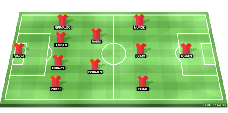 Spain are likely to shape up in a 4-2-3-1 formation with Unai Simon in goal vs Egypt. Pedro Porro and Alejandro Grimaldo will start as the full-backs. They will look to create opportunities for their teammates in the final third and keep the team defensively stable. Pau Cubarsi will start alongside Dean Huijsen at the heart of the defence.