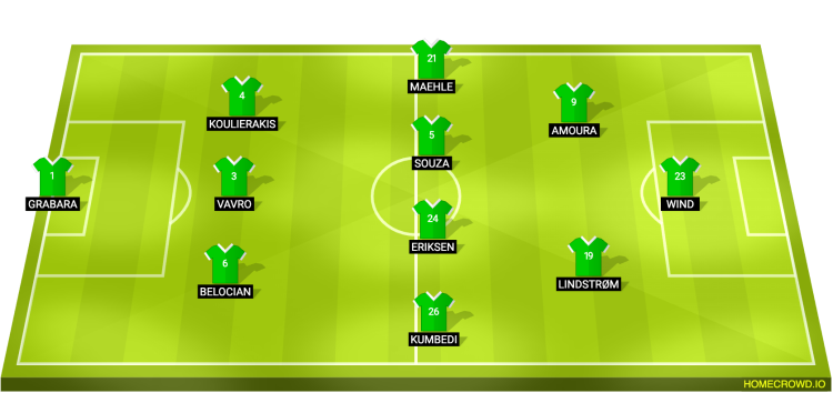 Probable Lineup (3-4-2-1): Grabara; Belocian, Vavro, Koulierakis; Kumbedi, Eriksen, Souza, Maehle; Lindstrom, Amoura; Wind