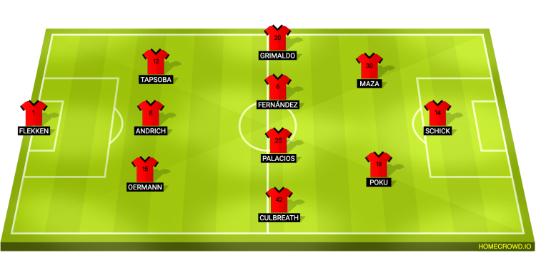 Probable Lineup (3-4-2-1): Flekken; Oermann, Andrich, Tapsoba; Culbreath, Palacios, Fernandez, Grimaldo; Poku, Maza; Schick
