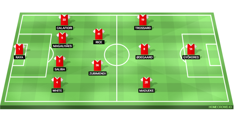 Predicted Arsenal XI: Raya; White, Saliba, Gabriel, Calafiori; Zubimendi, Rice; Madueke, Odegaard, Trossard; Gyokeres