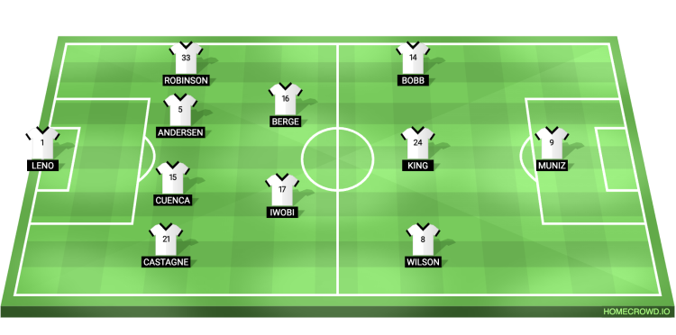 Probable Lineup (4-2-3-1): Leno, Castagne, Cuenca, Andersen, Robinson; Iwobi, Berge; Wilson, King, Bobb; Muniz