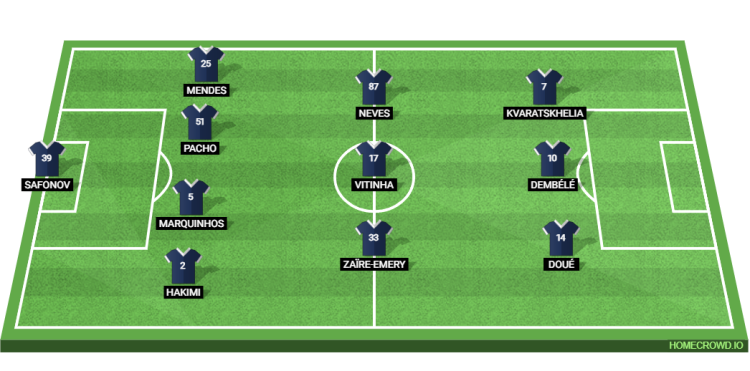 Probable Lineup (4-3-3): Safonov; Hakimi, Marquinhos, Pacho, Mendes; Zaire-Emery, Vitinha, Neves; Doue, Dembele, Kvaratskhelia