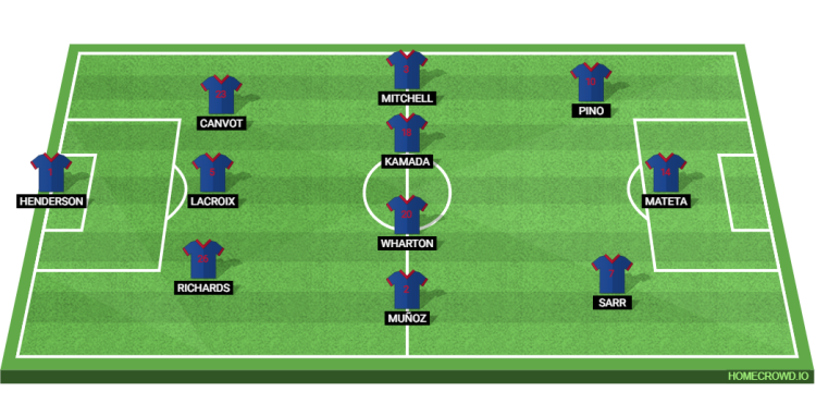 Probable Lineup (3-4-3): Henderson; Richards, Lacroix, Canvot; Munoz, Wharton, Kamada, Mitchell; Sarr, Mateta, Pino