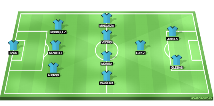 Probable Lineup (3-4-1-2): Radu; Alonso, Starfelt, Rodriguez; Carreira, Moriba, Vecino, Mingueza; Lopez; Iglesias, Jutgla