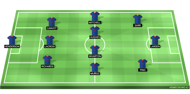Probable Lineup (3-4-2-1): Henderson; Canvot, Richards, Lacroix; Munoz, Hughes, Wharton, Mitchell; Sarr, Pino; Strand Larsen