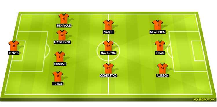 Probable Lineup (4-3-3): Riznyk; Tobias, Bondar, Matviienko, Henrique; Ocheretko, Nazaryna, Isaque; Alisson, K. Elias, Newerton