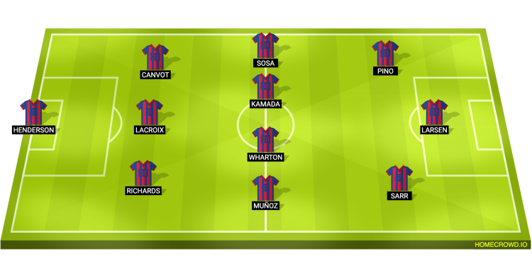 Probable Lineup (3-4-2-1): Henderson; Richards, Lacroix, Canvot; Munoz, Wharton, Kamada, Sosa; Sarr, Pino; Strand Larsen