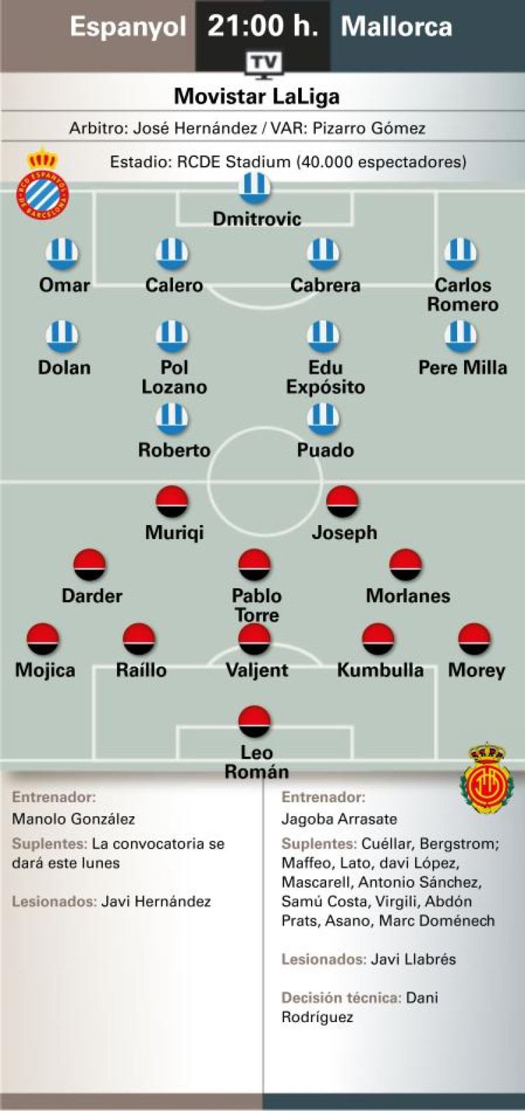 En la retaguardia, pocos cambios se atisban salvo conocer quién será la pareja de Cabrera. Calero partiría con ventaja pero no se descarta que opte por Miguel Rubio para parar al gigantón Muriqi. Por último arriba, Kike y Roberto pelean por quién será hoy el ’9’ de salida. Lo que sí es seguro es que caso de vencer, el Espanyol se catapultaría al podium de la clasificación liguera, pues podría acabar tercero la jornada. Tremendo.