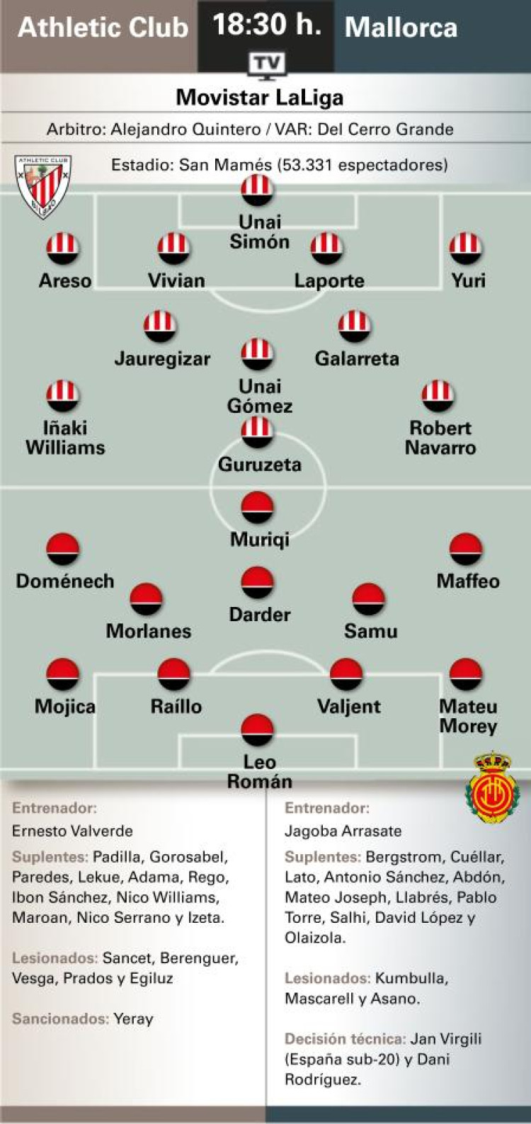 El once visitante bien podría estar formado por Leo Román; Maffeo, Valjent, Raíllo, Mojica; Samu, Morlanes; Mateu Morey, Darder, Doménech; y Muriqi. La última visita del Mallorca a San Mamés se saldó con empate a uno.
