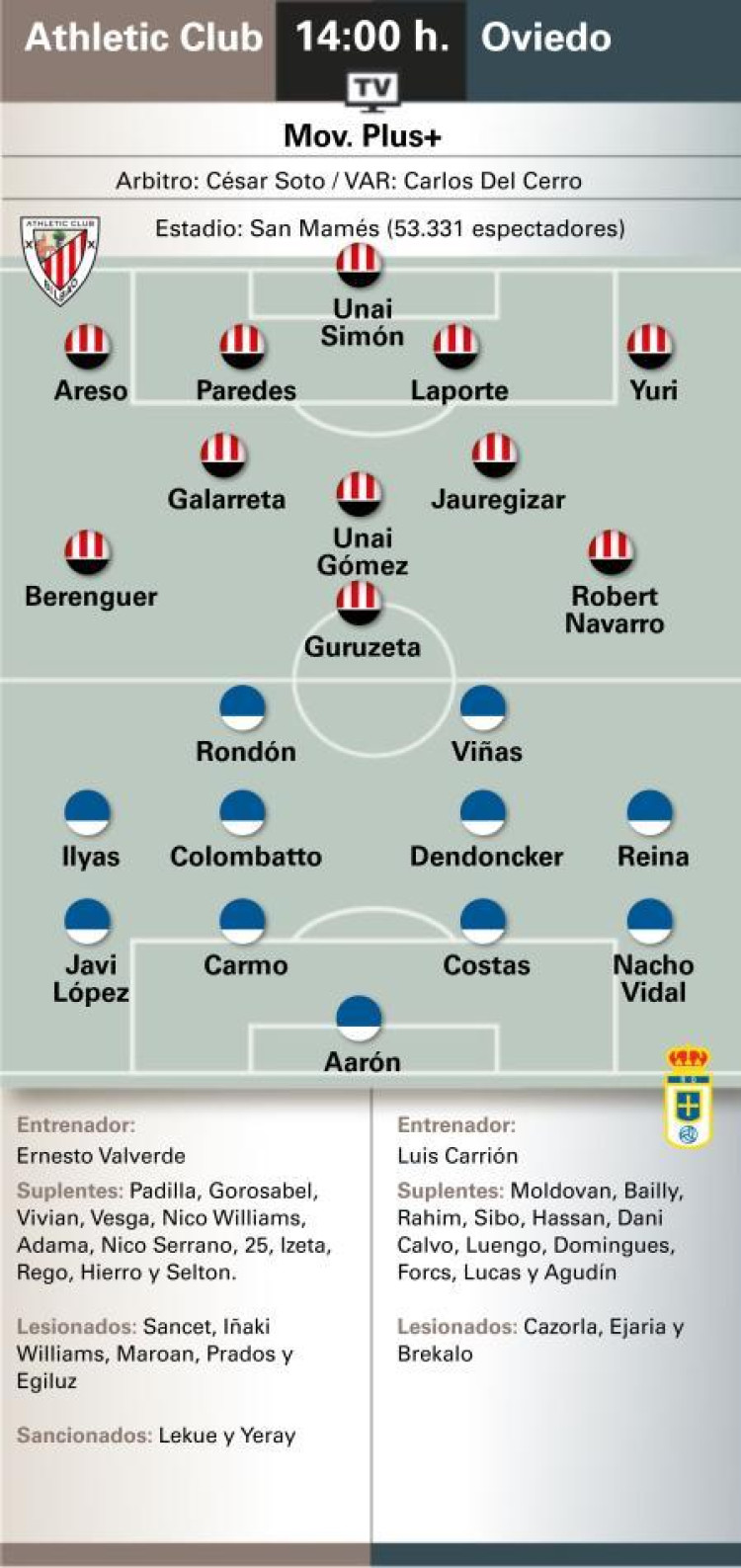 La necesidad de victoria por ambas partes marca el partido de hoy en Bilbao entre Athletic y Oviedo, partido que dará comienzo a las 14 horas. Los leones vienen de concatenar tres derrotas consecutivas, incluyendo la del pasado miércoles en Newcastle. Los carbayones, por su parte, se encuentran inmersos en la zona de descenso en su regreso a Primera División y sólo han sumado una victoria hasta la fecha.