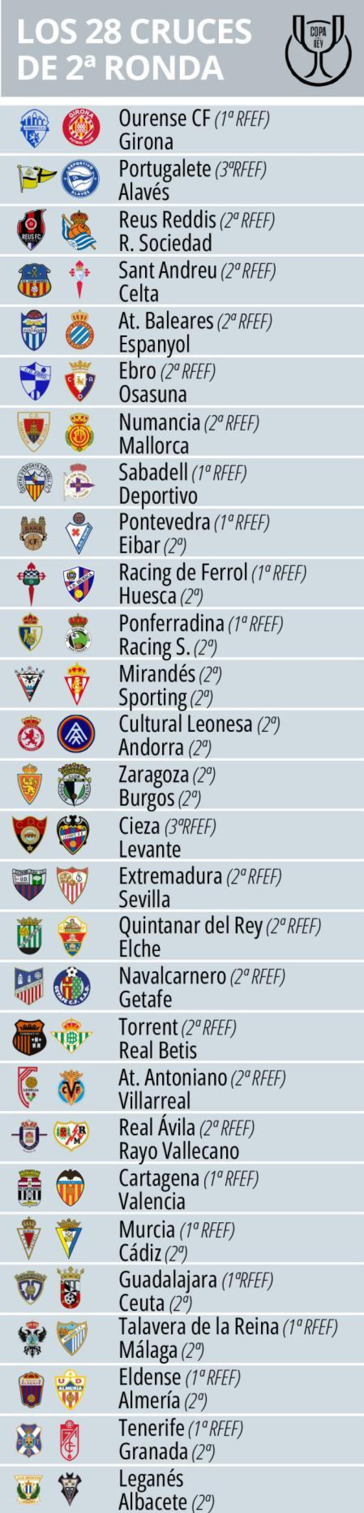 .Cabe recordar que estuvieron exentos de entrar en el sorteo todavía los equipos que disputan la Supercopa de España, que son el Real Madrid, el Barcelona, el Atlético de Madrid y el Athletic, y también que tampoco estuvo el Oviedo, que fue el único 'Primera' eliminado en la primera ronda con presencia de equipos de la máxima categoría del fútbol español.