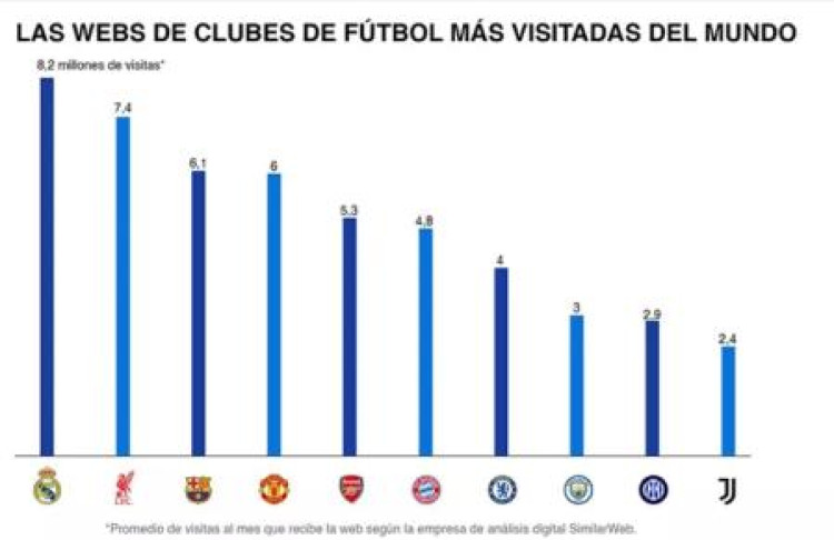 La web del Real Madrid, realmadrid.com es, por noveno año consecutivo, la página web de clubs de fútbol más vista del mundo, con una media de 8,2 millones de visitas al mes, según los datos de la empresa de análisis digital SimilarWeb. La web "cerró la temporada con un récord de 79 millones de usuarios únicos, un 16% más que el curso anterior", según explica la web del Real Madrid.