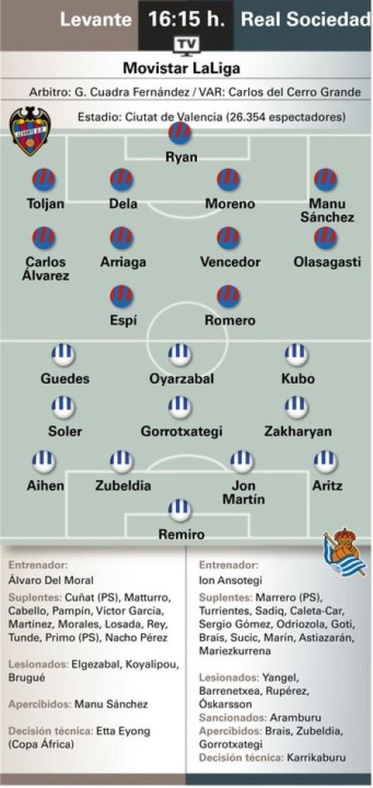 El Levante llega muy tocado a la cita, como colista liguero, eliminado de la Copa por un Segunda, sin entrenador desde finales de noviembre y sin ganar en Liga desde octubre ante el Oviedo. Cinco derrotas seguidas les tienen hundidos. Y ahora, además, pierden al goleador Etta Eyong por la Copa África, y la misma semana a Brugué y Koyalipou por lesión. Eso puede hacer que varíen la idea y la formación o que entre gente sin ritmo como Espí o Morales. Podría repetir el extxuri urdin Olasagasti tirado a la izquierda. La dupla interina Del Moral e Iborra deberá tomar cartas en el asunto en el que se intuye también como su último partido en el cargo.