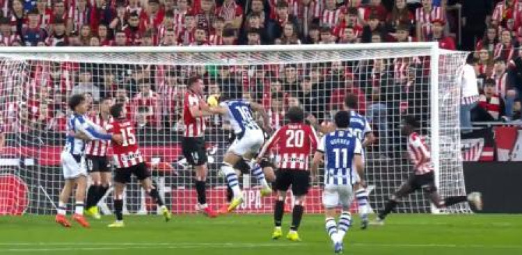 La primera parte del derbi vasco tuvo todos los ingredientes esperados: intensidad, duelos constantes y máxima competitividad entre dos equipos que no concedieron un centímetro. En ese contexto de ida y vuelta fue la Real Sociedad la que se mostró superior, generando las ocasiones más claras y rozando el gol en varias fases del encuentro. Sin embargo, el marcador no se movió y el 0-0 se mantuvo hasta el descanso. Fue casi entonces, antes en el añadido, cuando llegó la jugada que marcó el debate.