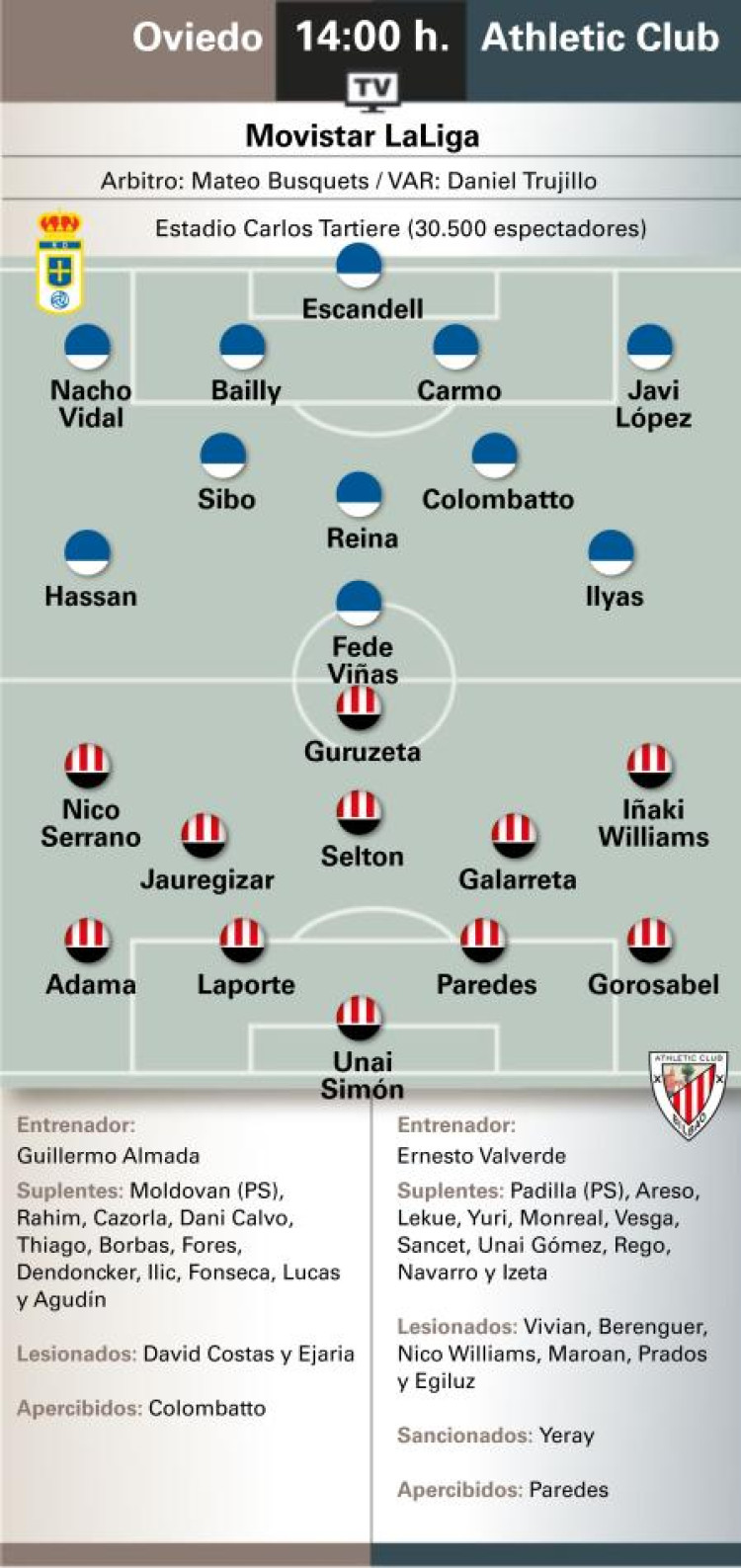 Posibles onces iniciales del partido entre el Real Oviedo y el Athletic