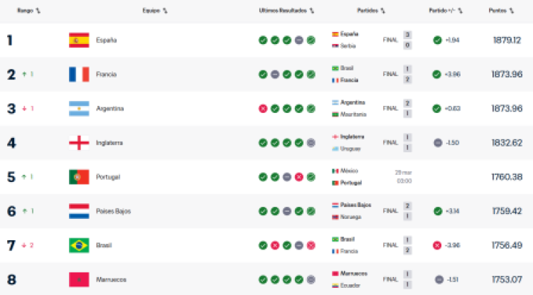 La Roja se sitúa así por encima de una Francia que gana puntos y que es segunda tras ganar ayer a Brasil (1-2) y que suma 1.873,96 puntos. Por detrás, en el tercer puesto, está una Argentina que ganó con sufrimiento a Mauritania y que pierde una plaza. Inglaterra sigue en 4ª posición y escalan una posición Portugal (5ª) y Países Bajos (6ª). La gran perdedora es una Brasil que baja dos escalones hasta el séptimo lugar.