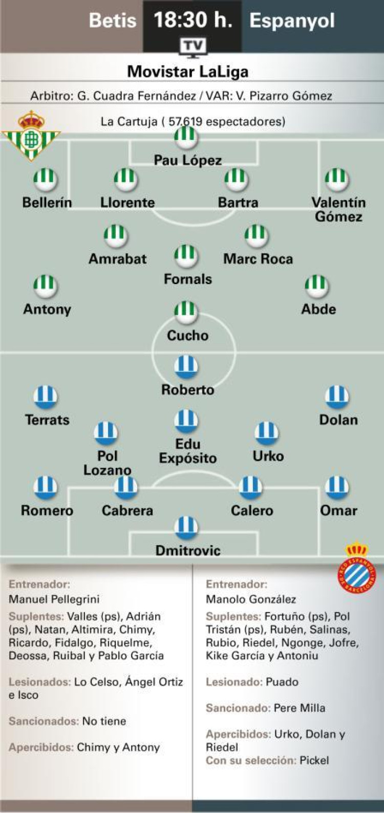 Calero, de estar ya recuperado de sus molestias, volverá al eje de la zaga, mientras que Pol Lozano y Roberto podrían también ser de la partida, en detrimento quizás de Ngonge y Kike García. Rubén Sánchez, que revolucionó cuando saltó ante el Getafe, podría tener su oportunidad de inicio. Visto el escenario, muchas incógnitas en el once de Manolo para un partido de nuevo capital para los catalanes.
