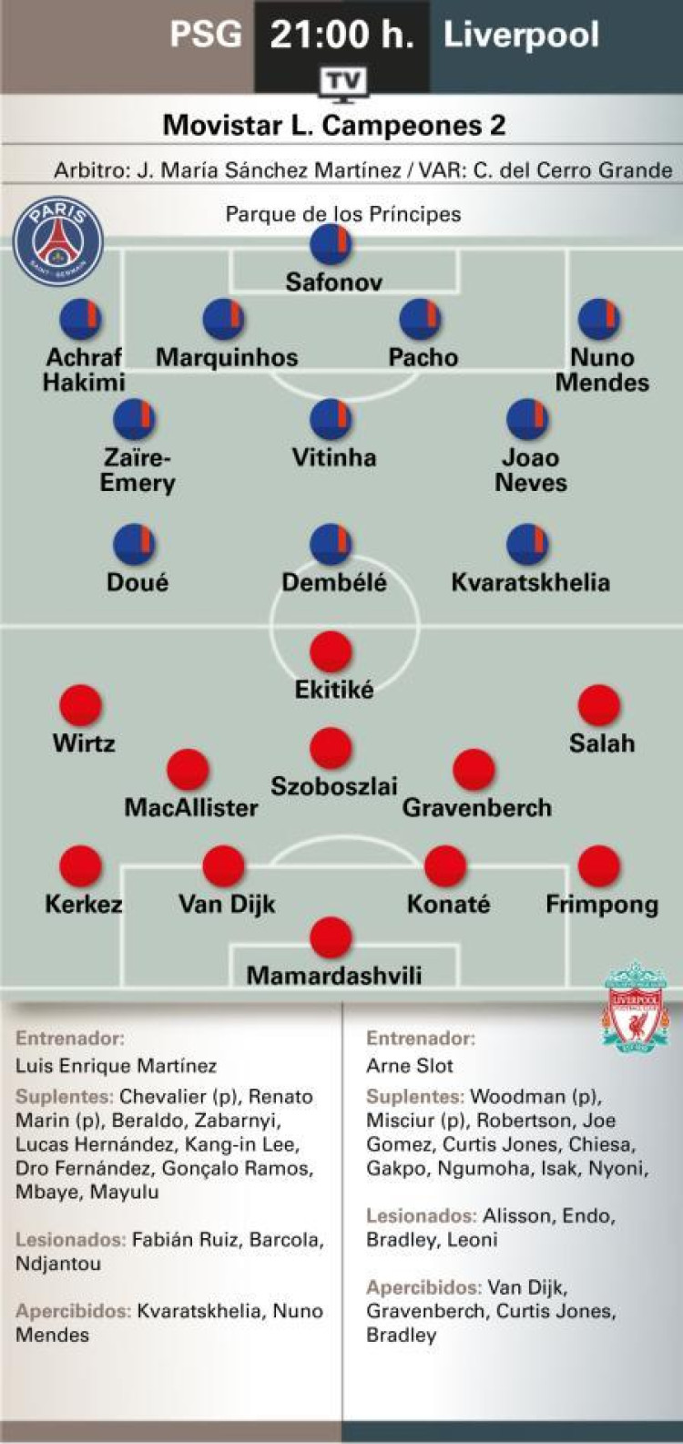 “Ser favorito en este tipo de partidos no significa nada”, aseguró ayer Luis Enrique, receloso por el 0-1 de hace un año. Vitinha, en la misma línea, avisó: “El Liverpool siempre será el Liverpool aunque no esté en su mejor forma”.