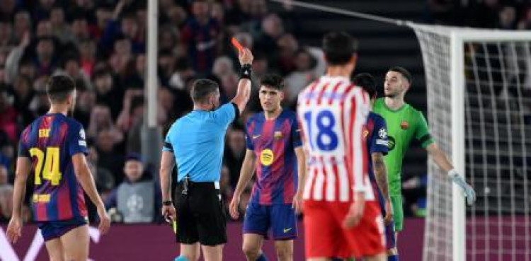 El árbitro rumano Istvan Kovacs le mostró tarjeta amarilla, el Atlético protestó y el alemán Christian Dingert,al frente del VAR, le invitó a ver las imágenes en el monitor. Kovacs se dirigió entonces hacia Cubarsí, anuló la amarilla y le mostró la tarjeta roja directa en el 44'.