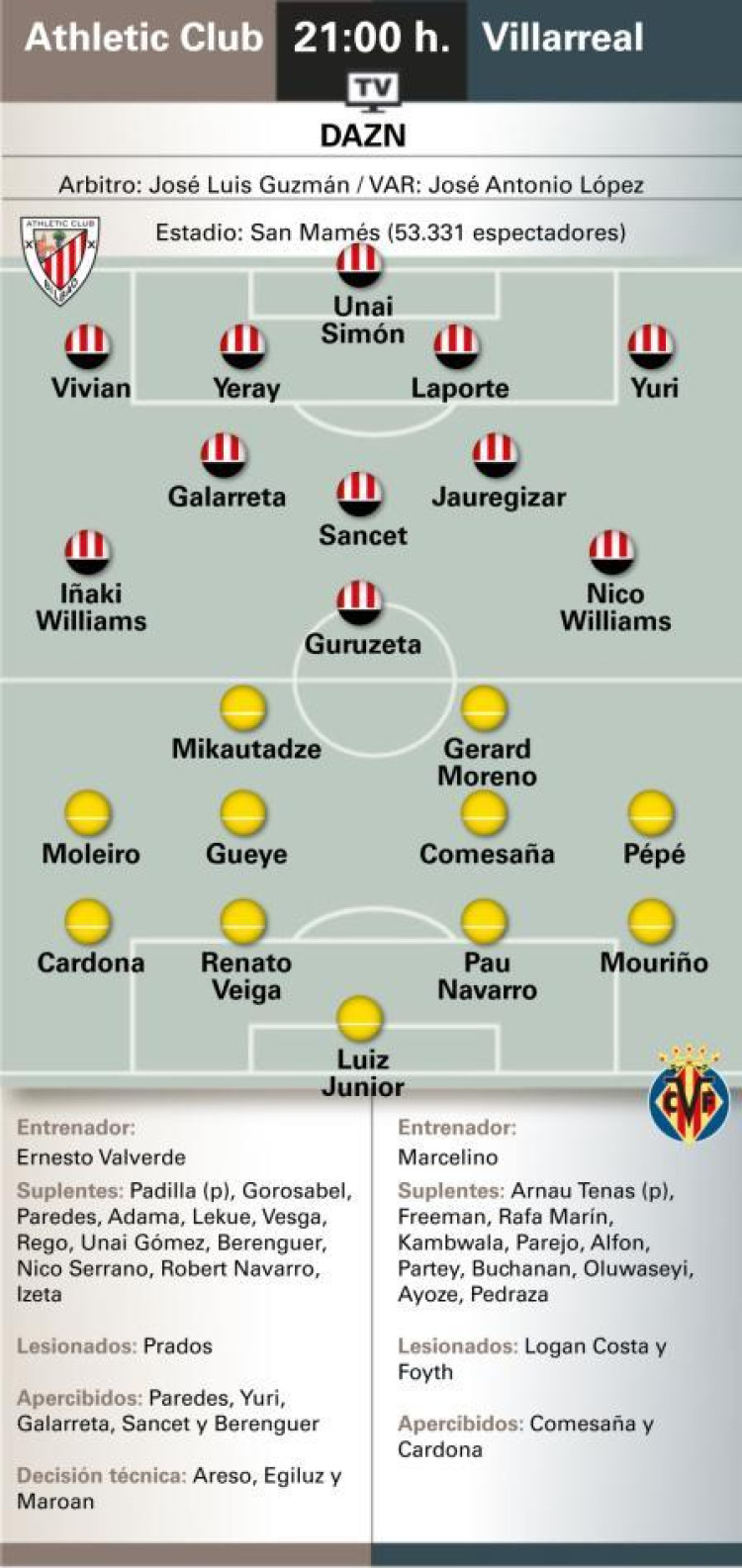 En lo deportivo, poca novedad en clave Athletic. No news, good news. Durante la semana se han ido reintegrando con el grupo Paredes y Gorosabel. Valverde igual alucinó pepinillos teniendo que hacer descartes para armar una lista de 23. La incógnita en el once volverá a estar, como de costumbre, en el lateral derecho.