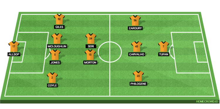Probable Lineup (4-2-3-1): Allsop; Coyle, Jones, McLoughlin, Giles; Morton, Seri; Philogene, Carvalho, Zaroury; Tufan
