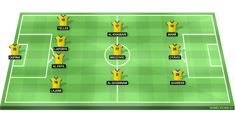 Probable Lineup (4-3-3): Ospina; Alawjami, Al-Fatil, Laporte, Telles; Al Ghanam, Al-Khaibari, Brozovic; Ghareeb, Otavio, Mane