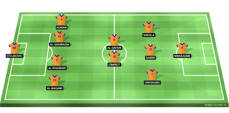 Probable Lineup (4-2-3-1): Stojkovic; Al Baqawi, Al-Khaibari, Al-Shuwaish, Konan; Al-Safri, Cimirot; Onyekuru, Sabiri, Sakala; Nwakaeme