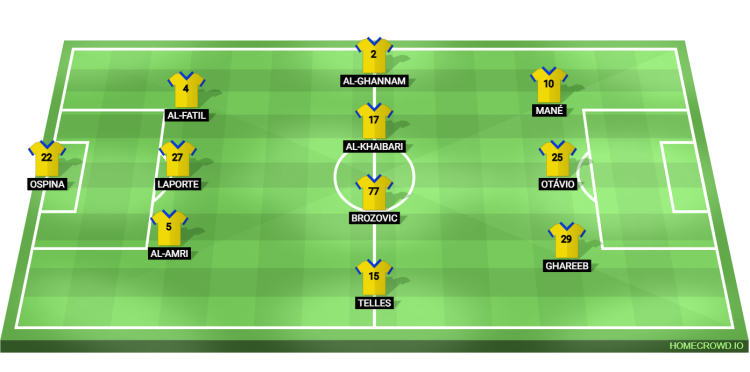 Probable Lineup (3-4-2-1): Ospina; Alamri, Laporte, Fatil; Telles, Brozovic, Khaibari, Ghanam; Ghareeb, Otavio; Mane