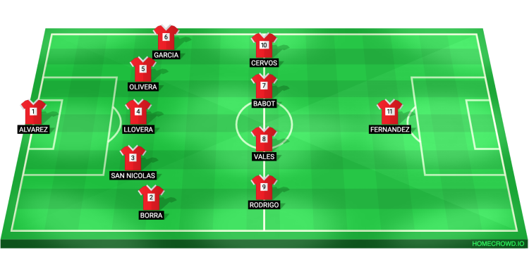 Probable Lineup (5-4-1): Alvarez; Borra, San Nicolas, Llovera, Olivera, M. Garcia; Rodrigo, Vales, Babot, Cervos; Fernandez