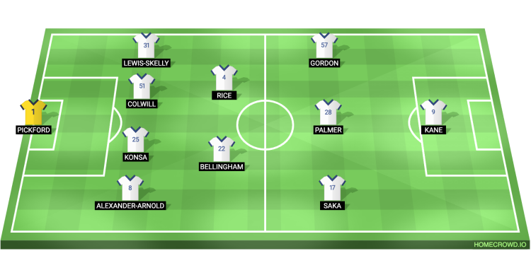 Probable Lineup (4-2-3-1): Pickford; Alexander-Arnold, Konsa, Colwill, Lewis-Skelly; Rice, Bellingham; Saka, Palmer, Gordon; Kane