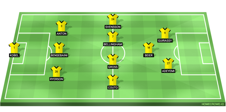 Probable Lineup (3-4-2-1): Kobel, Ryerson, Bensebaini, Anton, Couto, Svensson, Gross, Bellingham, Beier, Adeyemi, Guirassy