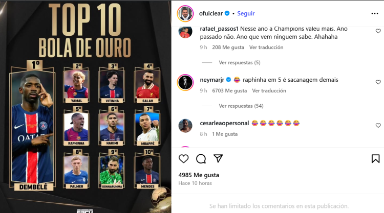 If anything, it was the rankings below the top two that inspired as the most ire. Neymar was less than impressed, and under a ranking of the top 10, commented that ‘Raphinha number five is taking the p***’.