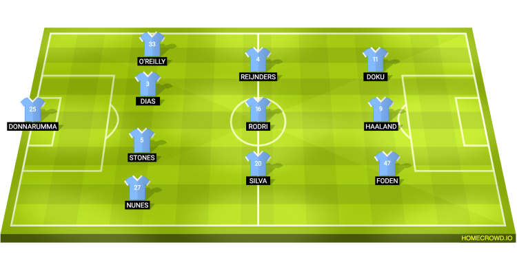 Probable Lineup (4-3-3) – Donnarumma; Nunes, Stones, Dias, O’Reilly; Silva, Rodri, Reijnders; Foden, Haaland, Doku