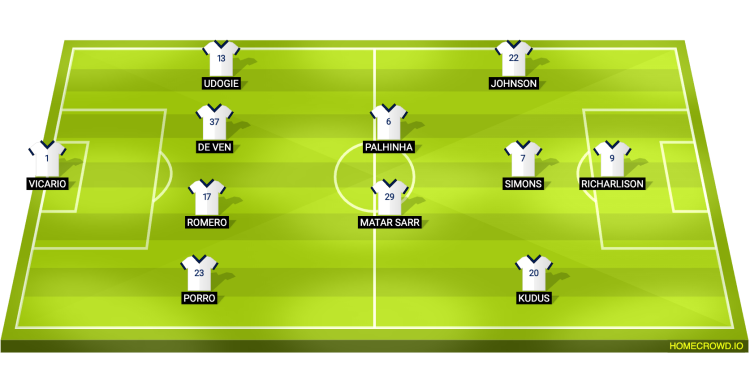 Probable Lineup (4-2-3-1) – Vicario; Porro, Romero, Van de Ven, Udogie; Sarr, Palhinha; Kudus, Simons, Johnson; Richarlison