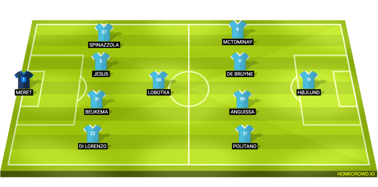 Probable Lineup (4-1-4-1): Meret; Di Lorenzo, Buekema, Jesus, Spinazzola; Lobotka; Politano, Anguissa, De Bruyne, McTominay; Hojlund