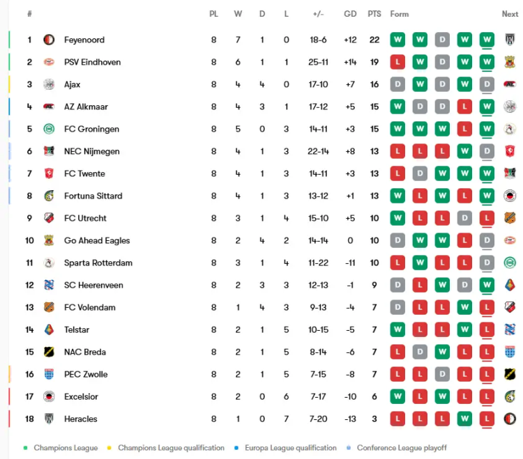 Sparta Rotterdam and Ajax kicked things off on Saturday with a six goal thriller. Wout Weghorts and Tobian Lauritesen scored just before the break to make it 1-1, before a quickfire double for Sparta from Mitchell van Bergen and Joshua Kitolano had the hosts 3-1 up after 55 minutes. Ajax dominated possession and finally responded in the 73rd minute through Weghorst again. Deep into added time Oscar Gloukh came up with a dramatic equaliser to earn the Amsterdam side a point.