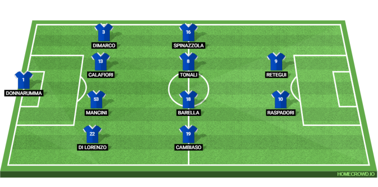 Probable Lineup (4-4-2): Donnarumma; Di Lorenzo, Mancini, Calafiori, Dimarco; Cambiaso, Barella, Tonali, Spinazzola; Raspadori, Retegui