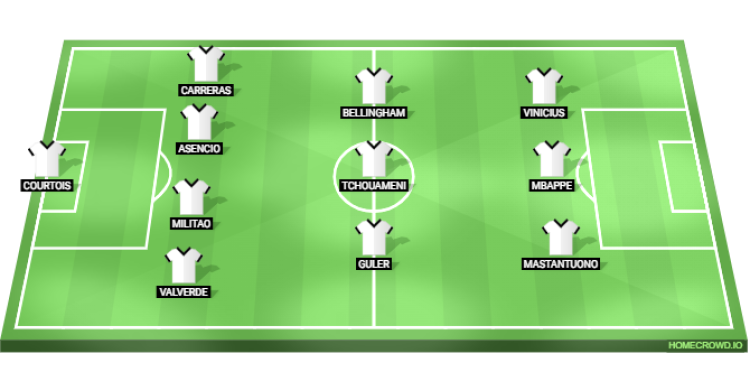 Predicted Real Madrid XI: Courtois; Valverde, Militao, Asencio, Carreras; Guler, Tchouameni, Bellingham; Mastantuono, Mbappe, Vinicius Junior
