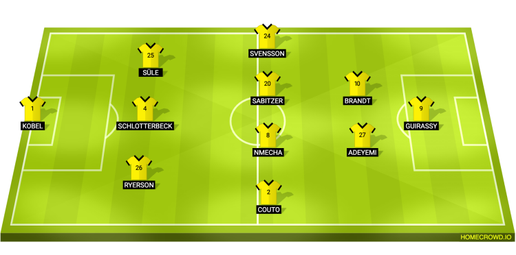 Probable Lineup (3-4-2-1): Kobel; Ryerson, Schlotterbeck, Sule; Couto, Nmecha, Sabitzer, Svensson; Adeyemi, Brandt; Guirassy