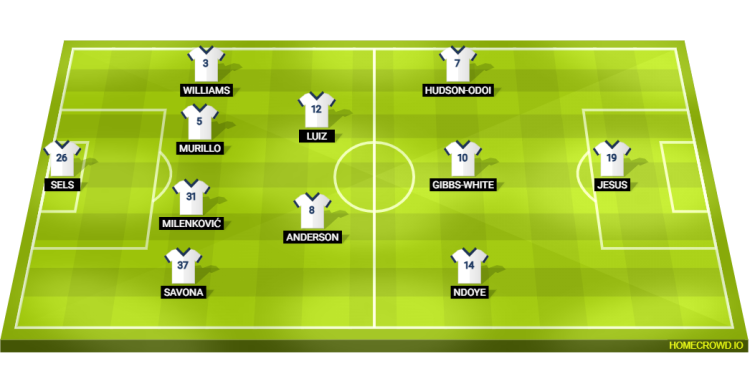 Probable Lineup (4-2-3-1): Sels; Savona, Milenkovic, Murillo, Williams; Anderson, Luiz; Ndoye, Gibbs-White, Hudson-Odoi; Jesus