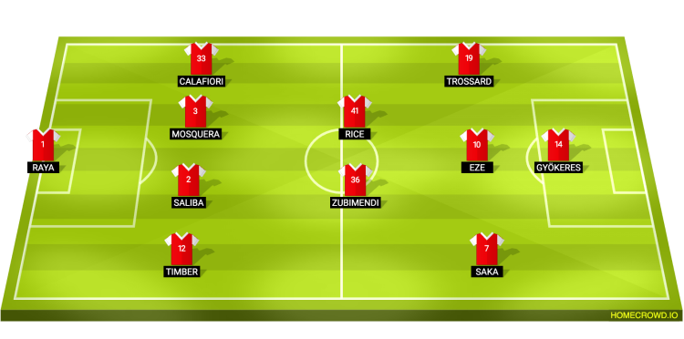 Predicted Arsenal XI: Raya; Timber, Saliba, Mosquera, Calafiori; Zubimendi, Rice; Saka, Eze, Trossard; Gyokeres