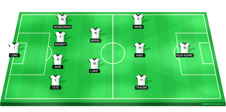 Probable Lineup (4-2-3-1): Leno, Tete, Diop, Bassey, Sessegnon, Berge, Lukic; Traore, King, Iwobi, Kusi-Asare.