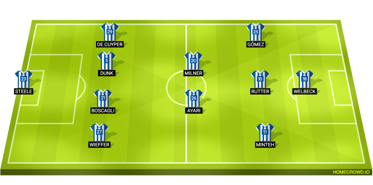 Probable Lineup (4-2-3-1): Steele; Wieffer, Dunk, Boscagli, De Cuyper; Milner, Ayari; Gomez, Rutter, Minteh; Welbeck