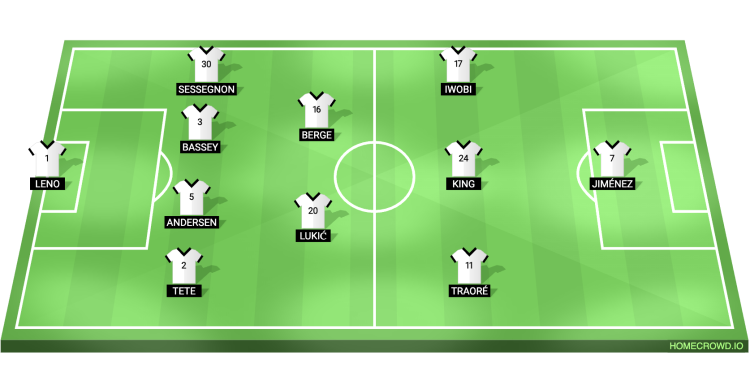 Probable Lineup (4-2-3-1): Leno, Tete, Andersen, Bassey, Sessegnon, Berge, Lukic; Traore, King, Iwobi, Jimenez.
