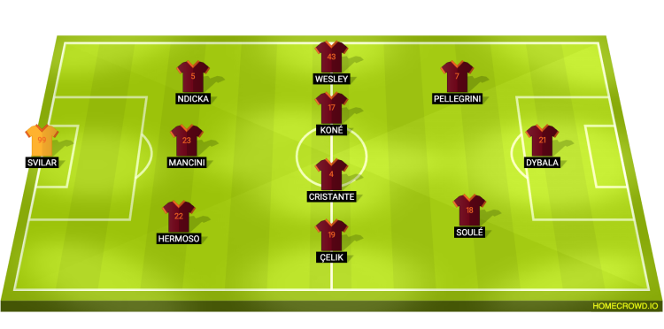 Probable Lineup (3-4-2-1): Svilar; Hermoso, Mancini, Ndicka; Celik, Cristante, Kone, Wesley; Soule, Pellegrini; Dybala