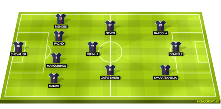 Probable Lineup (4-3-3): Chevalier; Hakimi, Marquinhos, Pacho, Mendes; Zaire-Emery, Vitinha, Neves; Kvaratskhelia, Dembele, Barcola