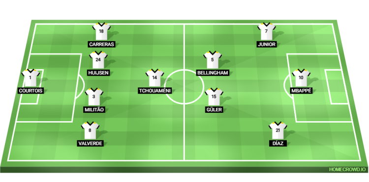 Predicted Real Madrid XI: Courtois; Valverde, Militao, Huijsen, Carreras; Guler, Tchouameni, Bellingham; Diaz, Mbappe, Vinicius Junior